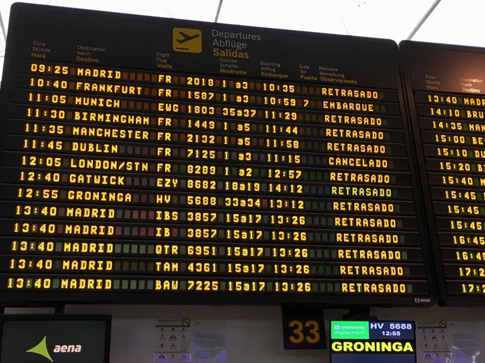Aunque la pantalla informativa mostraba un vuelo a Dublín cancelado y otros retrasados, también se debe al estado del tiempo en sus aeropuertos de destino, como ocurriera esta mañana con uno procedente de Bilbao que no puso despegar por el estado meteorológico allá.