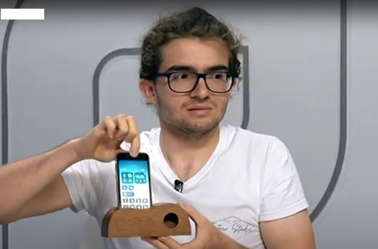 También nos sorprendió con un "altavoz pasivo" que él mismo ha creado. Inspirándose en la caja de un timple, ha adaptado sus creaciones para que tengan su utilidad en la generación de la telefonía móvil.