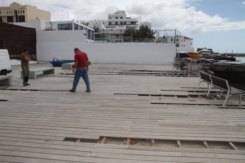 Operarios de la Concejalía de Vías y Obras del Ayuntamiento de Arrecife continúan con la reparación de los desperfectos de la tarima y el piso del parque Islas Canarias, pintado de muros y otras mejoras generales del espacio público.