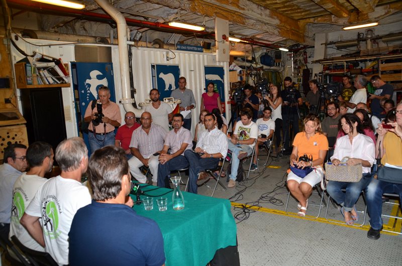 Miembros de la organización ecologista ofrecieron este lunes una rueda de prensa a bordo del barco en Lanzarote, en la que mostraron parte de la estrategia que mantendrán en este contencioso con el Estado español