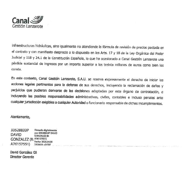 En respuesta, Canal Gestión Lanzarote asegura que se reserva el derecho de iniciar acciones legales para defender sus derechos y reclamar daños y perjuicios. De hecho, señalan la posible “reclamación de daños y perjuicios que pudieran derivarse de las decisiones adoptadas por este órgano de contratación, e incluyendo las posibles responsabilidades administrativas, civiles, contables e incluso penales ante cualquier jurisdicción exigibles a cualquier Autoridad o funcionario responsable de dichas incumplimientos”.