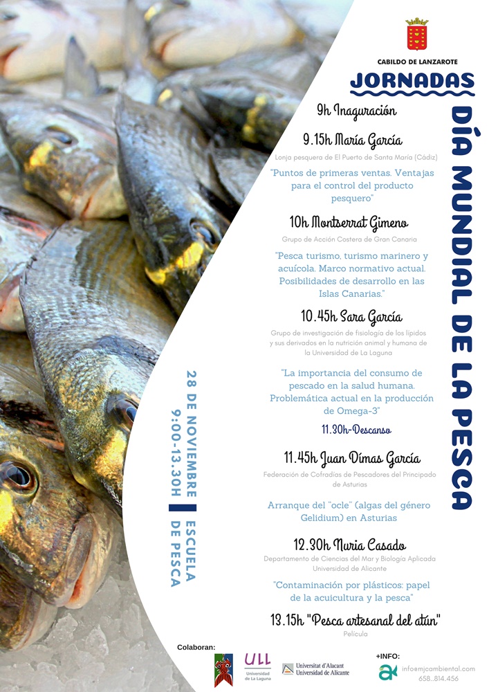 El Cabildo de Lanzarote, a través de la Consejería de Agricultura, Ganadería y Pesca que dirige el consejero Antonio Morales, celebrará este miércoles 28 de noviembre en el Instituto de Formación Profesional Marítimo Pesquero de Canarias (Escuela de Pesca) de Arrecife unas jornadas con motivo de la celebración del Día Mundial de la Pesca, en colaboración con las Universidad de La Laguna (ULL) y la Universidad de Alicante.