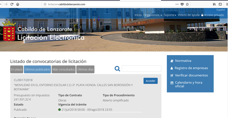 El Cabildo de Lanzarote recuerda que de conformidad con todos los requisitos legales y técnicos dispuestos en la Ley de Contratos del Sector Público y demás normativa de desarrollo, todas las empresas licitadoras que quieran participar de los procesos de contratación del Cabildo de Lanzarote o de cualquiera de sus entes autónomos (Red tributaria, SPEL, EPEL, Consejo Insular de Aguas, Consorcio de Seguridad y Emergencias, Instituto de Atención Social o el Consorcio del Agua de Lanzarote) deberán hacerlo a través de la nueva Plataforma de Contratación Electrónica de la Corporación: http://licitacion.cabildodelanzarote.com. Informa en este sentido, que todos los procedimientos de contratación superiores a 5.000 euros, incluidos los menores, se tramitarán a través de este nuevo portal para licitadores del Cabildo de Lanzarote y sus entes autónomos.