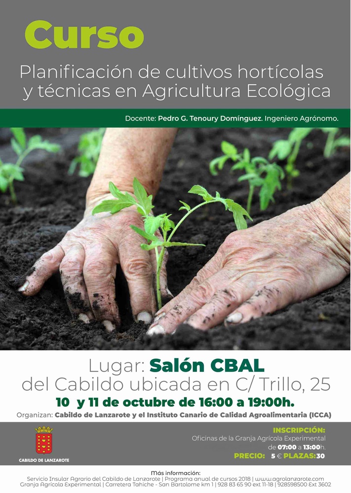 El Cabildo de Lanzarote, junto al Instituto Canario de Calidad Agroalimentaria del Gobierno de Canarias, organiza el curso 'Planificación de cultivos hortícolas y técnicas en agricultura ecológica'; lo hacen a través del Área de Agricultura que dirige el consejero Antonio Morales. Está previsto que se desarrolle del 10 al 11 de octubre en La Granja en horario de tarde, de 16.00 a 19.00 horas, en el Salón del Centro de Biodiversidad Agrícola de Lanzarote.