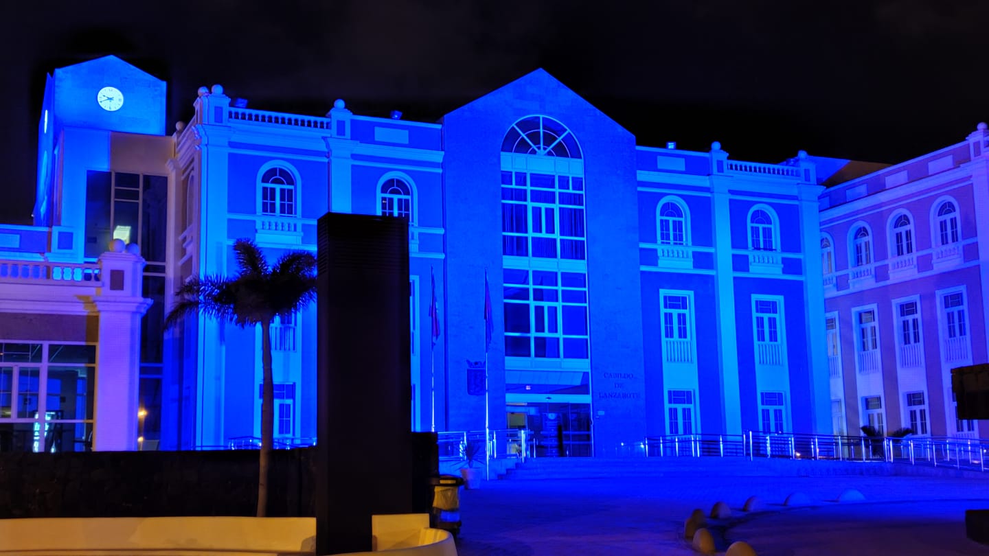 La fachada principal del Cabildo de Lanzarote se iluminó este viernes de color azul con motivo del Día Internacional del Autismo que, como cada año, se celebra el 2 de abril en todo el mundo.