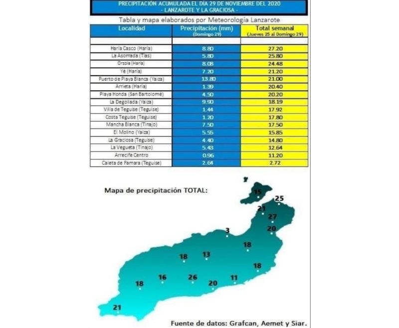 Para los curiosos estos son algunos datos de la lluvia caída en estos días (ver cuadro). Tras Haría con casi 28 litros por metro cuadrado, le sigue en el acumulado la Asomada en Tías, con casi 26 litros (ayer domingo sólo 6 litros), luego se situaría Órzola con cerca de 25 litros (unos 9 litros ayer). En la zona centro cabe destacar Playa Honda con unos 20 litros (ayer 4´5 litros) o Mancha Blanca con un acumulado de casi 18 litros (ayer unos 8 litros).