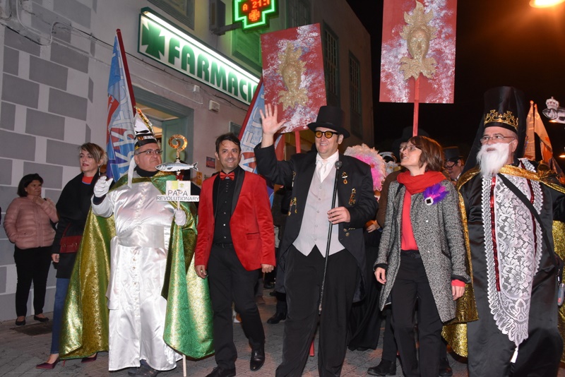 Maxi Ferrer, que asegura ser un gran carnavalero, sorprendió con su espectáculo. Al showman lo acompañó la "Batucada Villa Pipol", entre otras colaboraciones, en un recorrido, que empezó a las 19.00 horas en la zona conocida como 'Las Cuatro Esquinas' pasando por la Calle Real y culminando en el Kiosco de la Música de la Avenida La Marina.