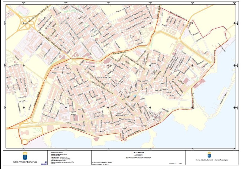 Concretamente, según recoge el BOC, la zona delimitada comprende la Rambla Medular, desde su intersección con la calle José Antonio Primo de Rivera hasta la intersección con la calle León y Castillo; la calle León y Castillo hasta su intersección con la calle del Donante de Sangre; la calle Escotilla hasta su encuentro con la calle Trinquete; la calle de los Zarapicos; la calle de la Era hasta su encuentro con la Avenida de Naos, continuando por el litoral de Arrecife en dirección a las Avenidas Olof Palme, Avenida Vargas, Avenida Coll, Avenida La Marina, la calle Blas Cabrera Felipe, la calle Doctor Ruperto González Negrín, la Avenida Dr. Rafael González Hernández, la Avenida Mancomunidad, la Avenida Fred Olsen hasta la calle José Antonio Primo de Rivera.