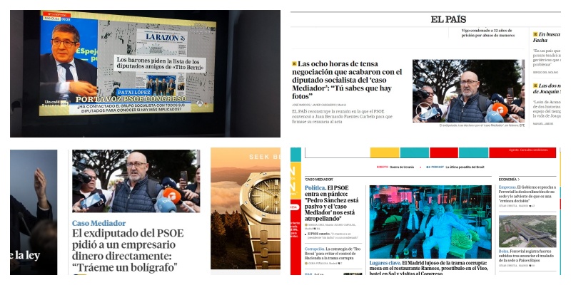 Tele Cinco, Antena Tres, Televisión Española, la Sexta y Cuatro, son las que más están incidiendo desde hace días en el caso de las comisiones, extorsiones a empresarios y fiestas, tras cenas nocturnas. En algunas de ellas, incluso, han salido imágenes de prostitutas, cocaína, viagras y alcohol. Hasta la Cadena Ser, próxima al PSOE, que inicialmente trató el tema de perfil no le ha quedado más remedio que entrar de lleno al trapo del caso Tito Berni. Es cierto que los medios de izquierdas presentan el caso Mediador más como un sainete muy propio de la España que tan bien reflejó el gran Berlanga en la Escopeta Nacional que como un caso de presunta corrupción que pueda afectar a la estructura del PSOE.