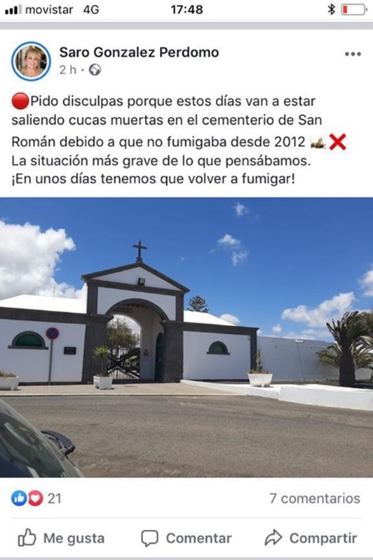 El cementerio municipal de Arrecife tendrá que cerrar nuevamente por la plaga de cucarachas. Así lo ha anunciado la concejala del ramo, Saro González, en su cuenta de Facebook asegurando que "la situación es más grave de lo que pensábamos" y anunciando que "en unos días tendremos que volver a fumigar".