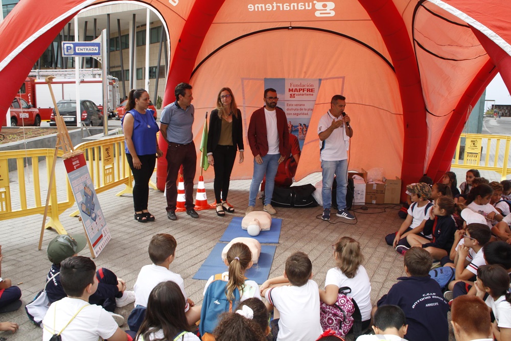 La 'Campaña de prevención orientada a reducir los riesgos de ahogamiento asociados al desconocimiento del medio acuático y de las medidas básicas de prevención en los usuarios de playas de la Isla de Lanzarote', comenzó esta semana en la playa de El Reducto y recorrerá los siete municipios incluida La Graciosa durante todo el verano, finalizará el 1 de septiembre en Tías. El objetivo es evitar ahogamientos tanto en la playa, como en piscina, por ello se forma en técnicas cardiorrespiratorias que salvan vidas. En la presentación estaban: el presidente del Consorcio de Seguridad y Emergencias de Lanzarote, Echedey Eugenio; la representante de Actividad de la Fundación MAPFRE Guanarteme, Laura Ojeda; y el director de Educación del Gobierno de Canarias, Mario Pérez; entre otras autoridades y representantes municipales.