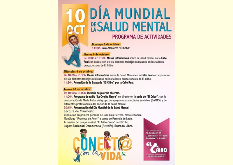 La asociación “El Cribo”, en consonancia con el lema de este año, reivindica una salud mental más positiva a través de la promoción de la salud mental y la prevención del suicidio, acabar con los mitos e ideas erróneas para facilitar la desestigmatización e invita a la sociedad de Lanzarote a participar en estos actos en pro de conocer más sobre la Salud Mental, su prevención, los tratamientos y los recursos existentes para la recuperación de las personas con enfermedad mental, además de hacer un llamamiento a aquellas personas con ideaciones suicidas para decirles que la vida merece la pena y hay mucha gente dispuesta a tenderles la mano cuando se sientan solas.