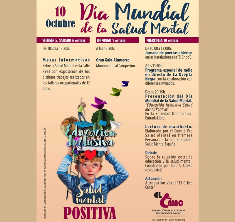 La asociación “El Cribo”, en consonancia con el lema de este año, reivindica una educación que apueste por los valores, que trabaje la diversidad y la inclusión, para que se consiga una salud mental más positiva en las generaciones futuras e invita a la sociedad de Lanzarote a participar en estos actos en pro de conocer más sobre la Salud Mental, su prevención, los tratamientos y los recursos existentes para la recuperación de las personas con enfermedad mental y con el objetivo de reducir el estigma asociado a este tipo de enfermedades.