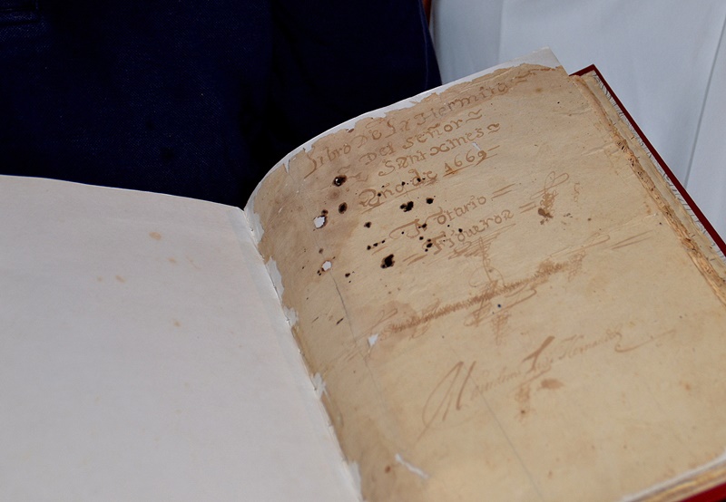 El párroco Miguel Hernández presentó este libro y sus anotaciones, que tiene 350 años de existencia
