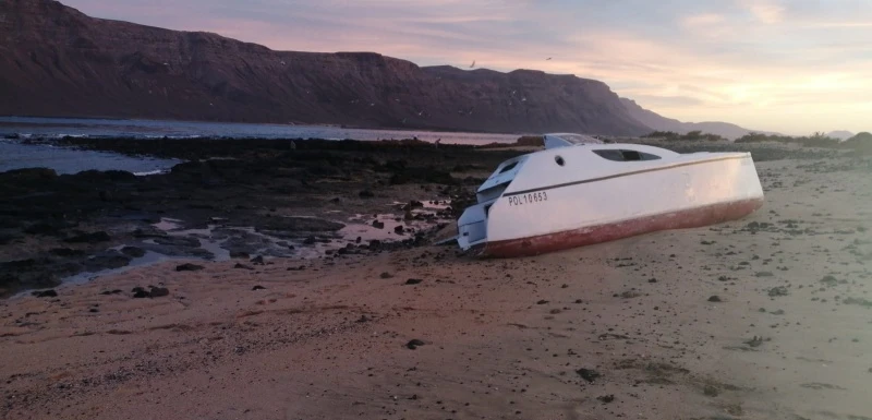 Casi un mes después del accidente el catamarán casi ha desaparecido por los golpes de mar y sólo queda un resto sobre la arena. En cambio, los dos tripulantes siguen por La Graciosa, según fuentes de la Octava Isla.