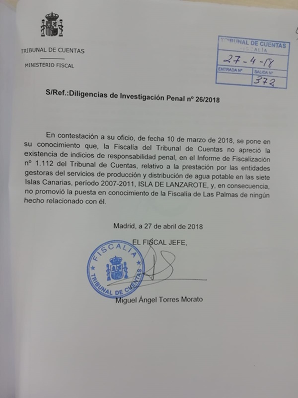 Por último, y todavía más importante, el actual consejero de CC apunta en un comunicado que a todo ello, se suma el escrito remitido al Juzgado por el Fiscal Jefe del Tribunal de Cuentas (Se adjunta), en respuesta a un oficio de la juez en el marco de las diligencias de investigación, en el que señala que “no apreció la existencia de indicios de responsabilidad penal en el Informe de Fiscalización nº 1.112 del Tribunal de Cuentas, relativo a la prestación por las entidades gestoras del servicio de producción y distribución de agua potable..., período 2007-2011, ISLA DE LANZAROTE ", y en consecuencia, no promovió la puesta en conocimiento de la Fiscalía de Las Palmas de ningún hecho relacionado con él”.