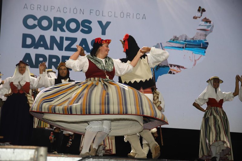 Los encargados de cerrar esta noche dedicada al folclore fueron los recientes Medalla de Oro de Canarias, Coros y Danzas de Arrecife. Sesenta años sobre los escenarios son garantía más que suficiente para saber que nunca decepcionan. El grupo que dirige Santiago Torres, además de atesorar un gran talento musical, ha hecho una enorme labor de recuperación de los trajes tradicionales de Lanzarote y eso se traduce en un espectáculo vistoso y colorido.