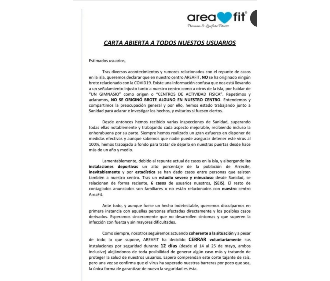 El gimnasio del Centro Comercial Arrecife, AreaFit, han enviado un comunicado a todos sus socios para aclarar que, a pesar de los rumores, su centro deportivo no ha sido el origen de ningún brote de covid 19. “Existe una Información confusa que nos está llevando a un señalamiento injusto tanto a nuestro centro como a otros de la isla, por hablar de un gimnasio como origen del brote. Repetimos y aclaramos, no se originó brote alguno en nuestro centro. Entendemos y compartimos la preocupación general y por ello, hemos estado trabajando junto a Sanidad para aclarar e investigar los hechos, y evitarlos si fuesen ciertos”, señalan.