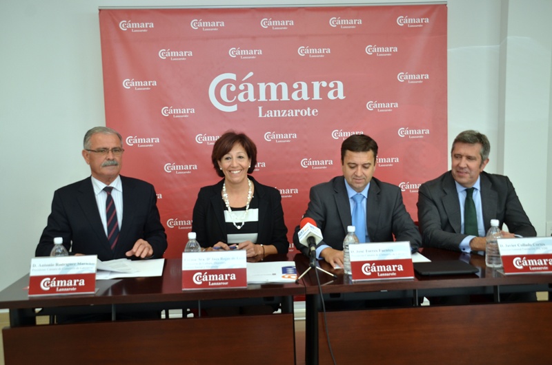 La consejera de Cultura, Inés Rojas, y los presidentes de la cámaras de comercio de Lanzarote y Fuerteventura, José Torres y Antonio Rodríguez, respectivamente, junto al el director general de la Fundación Instituto Cameral para la Creación y Desarrollo de la Empresa, Fundación INCYDE, Javier Collado, han estado presentes en el acto de la firma.
