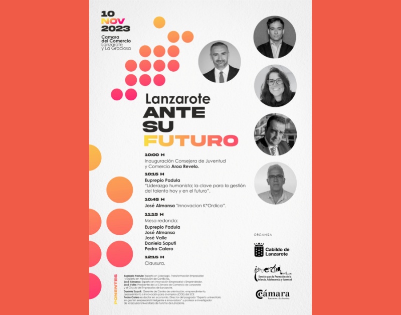 En estas primeras jornadas, organizadas por la Consejería de Juventud del Cabildo de Lanzarote, que coordina Aroa Revelo, y que cuenta con la colaboración de La Cámara de Comercio de Lanzarote y Fuerteventura y de CICAR, participarán José Valle, presidente de la Cámara de Comercio; Daniela Saputi, gerente del COE; y Pedro Calero, director de post-grado de Turismo, además de dos invitados de excepción: Euprepio Padula, experto en liderazgo político y empresarial; y el presentador y periodista y presidente de Padula&Partners, José Almansa, uno de los emprendedores en innovación de mayor importancia de España.