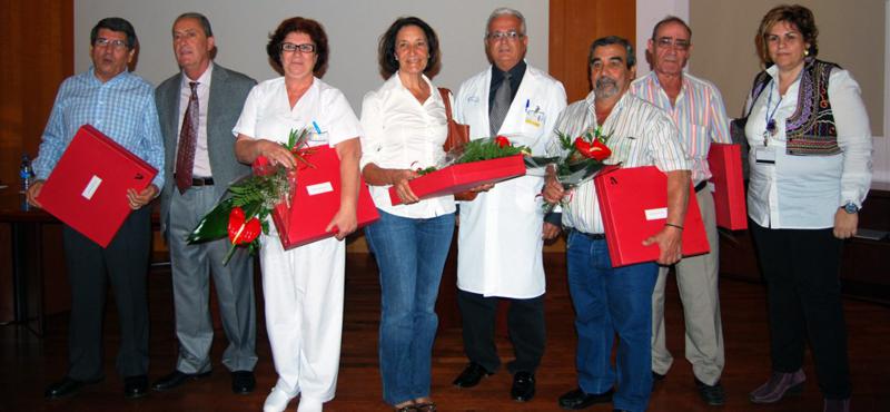 Los homenajeados, que estuvieron acompañados de sus familiares y compañeros, son Ginés Hernández Hernández, auxiliar administrativo; Rosario Nuez Domingo, auxiliar de Enfermería; Alfredo Fernández Paredes, jefe de Sección de Radiología; Magdalena Vázquez García, auxiliar de Clínica; Ana María Miranda Cabrera, auxiliar de Clínica; y Narciso Fuentes Cabrera, celador.