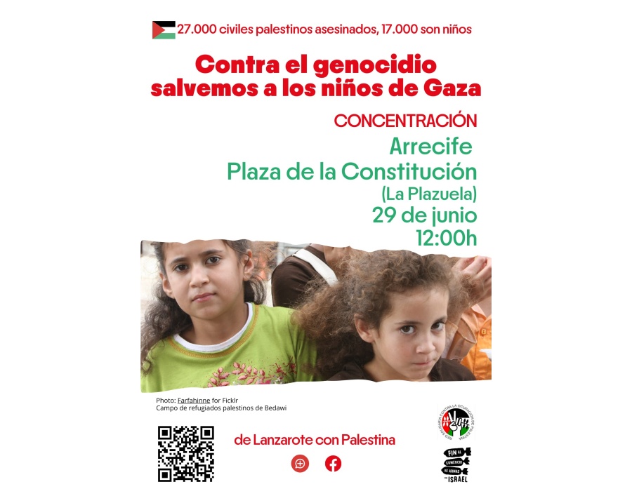 El colectivo De Lanzarote con Palestina vuelve a convocar a la población de la isla a mostrar su solidaridad con el pueblo palestino y a reclamar el fin del genocidio en Gaza. En esta nueva cita por la paz, la entidad humanitaria dedica su manifiesto al impacto de la guerra sobre la infancia y propone la asistencia con ropa negra, en señal de duelo por los más de 15.000 niños y niñas asesinados hasta la fecha desde el inicio del conflicto.