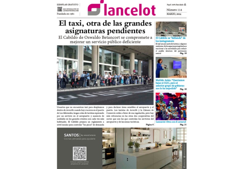 Un nuevo número del periódico Lancelot en papel está ya en la calle. Esta edición trata como reportaje principal los problemas que sufre la isla con la escasez de taxis, que provocan imágenes que no nos benefician. Usuarios que no encuentran taxi para desplazarse dentro de Arrecife cuando hay cruceros en el puerto de Los Mármoles, largas colas de turistas esperando por un servicio en el aeropuerto y ausencia de unidades en los grandes eventos son cada vez más habituales. El Cabildo prepara un reglamento a nivel insular para controlar "los picos" de demanda y para declarar áreas sensibles al aeropuerto y el puerto. Los taxistas de Arrecife y la Cámara de Comercio están a favor de esa regulación, pero hay más reticencias en las otras dos cooperativas del sector.
