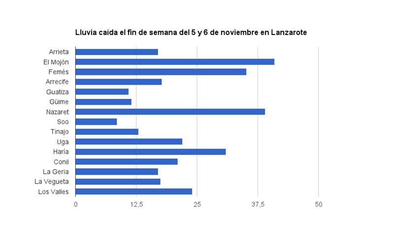 Nazaret, con 39 litros por metro cuadrado, tampoco se quedó corto de agua, como tampoco Femés, con 35,2, y Haría, con 31. En Los Valles, las lluvias dejaron el fin de semana 24 litros por metro cuadrado, mientras en Uga fueron 22. Por detrás se sitúan Conil, con 21,1; Arrecife, con 17,8; La Vegueta, con 17,5; Arrieta y La Geria, con 17; Tinajo, con 13; Güime, con 11,5; Guatiza, con 11; y Soo, con 8,6.
