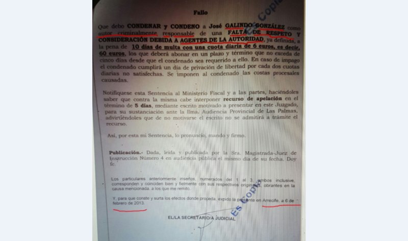 El Juzgado de Instrucción número 4 de Arrecife le consideró culpable de "una falta de respeto y consideración debida a agentes de la autoridad" y le condenó a pagar una multa de 60 euros. Multa que Galindo afirma que hizo efectiva, como le solicitó el fiscal "para no seguir discutiendo". Y es que, el senador mostró su disconformidad con los hechos al ser preguntado por La Provincia, aunque tampoco dio su versión de lo ocurrido. Eso sí, dijo no tener "nada pendiente con la ley" y no temer que salgan nuevas cosas a la luz.