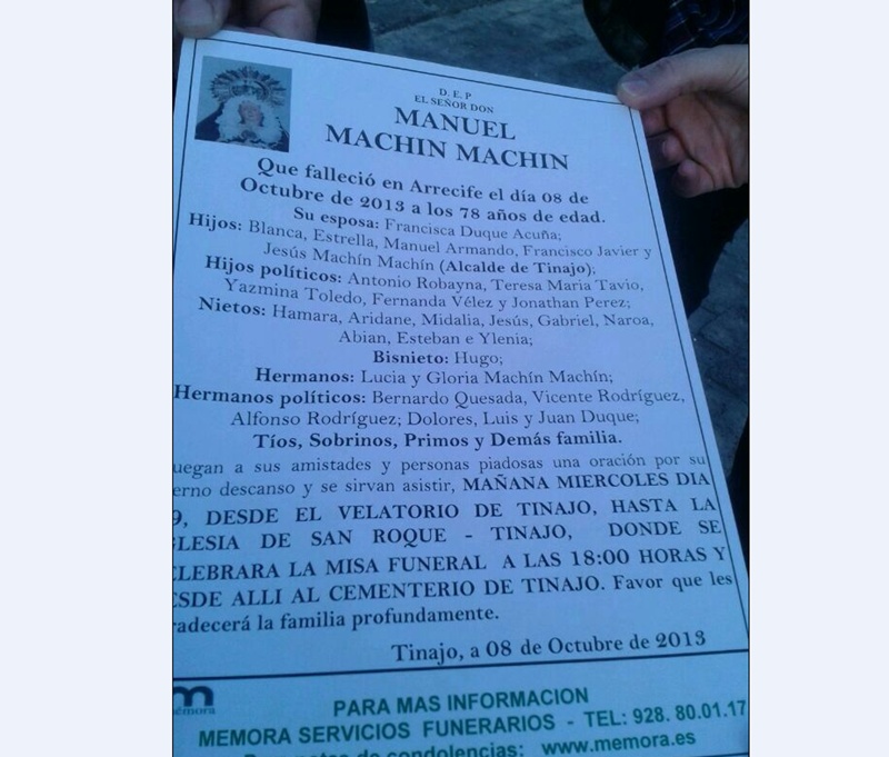 El entierro de Manuel Machín, padre del alcalde de Tinajo, Jesús Machín, se celebrará este miércoles por la tarde. Concretamente, a las 18.00 horas será la misa funeral en la iglesia de San Roque y de ahí se partirá al cementerio de la localidad.