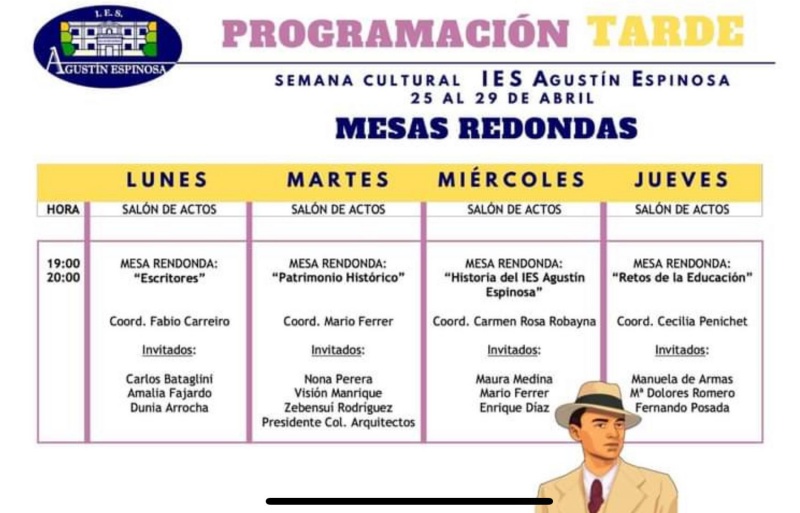 El miércoles le tocará el turno a la historia viva del centro, es decir, a contar la propia vivencia del Instituto mediante testimonios de antiguos profesores y alumnos. La directora actual, Carmen Rosa Robayna, coordinará una charla en la que participarán Mercedes Maura Palarea Medina, Enrique Díaz y Mario Ferrer. Y finalmente, el ciclo se clausurará el jueves 28 de abril con una mesa redonda sobre Educación coordinada por la Jefa de Estudios, Cecilia Peniñet, y que contará con la consejera de Educación del Gobierno de Canarias, Manuela de Armas, la directora del CEIP Capellanía de Yágabo, María Dolores Romero y el especialista Fernando Posada.