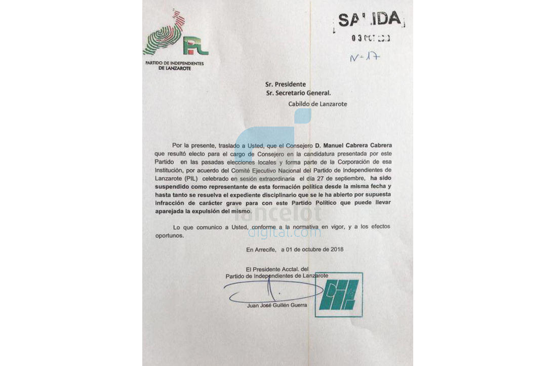 El tres de octubre se notificaba al Cabildo de Lanzarote, la resolución del Comité Insular del PIL del pasado 27 de septiembre de suspensión de militancia de Manuel Cabrera por supuestas infracciones graves, tal y como adelantó en exclusiva LANCELOT DIGITAL en la noche de ayer, jueves día 18. El escrito del PIL dirigido al presidente del Cabildo y al secretario general de la institución se da cuenta de expediente disciplinario abierto al hoy vicepresidente del Cabildo, Manuel Cabrera, para advertir que está suspendido cautelarmente de militancia que podría acabar en expulsión definitiva para los efectos oportunos que procedan.