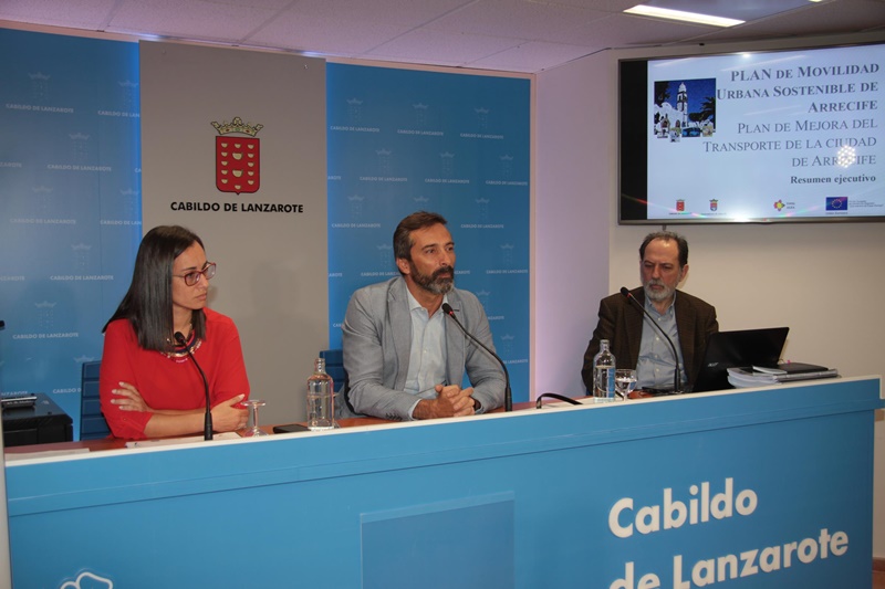 El presidente del Cabildo de Lanzarote, Pedro San Ginés, acompañado por la consejera insular de Transportes y Movilidad, Patricia Pérez, han presentado este lunes el "Plan de Movilidad Urbana Sostenible de Arrecife. Plan de Mejora del Transporte en la Ciudad de Arrecife", un documento cuya redacción se adjudicó a la empresa Tool Alfa, S.L. por un importe de 78.259,80 euros cofinanciados mediante el Programa Operativo FEDER de crecimiento sostenible 2014-2020 y fondos propios del Cabildo.