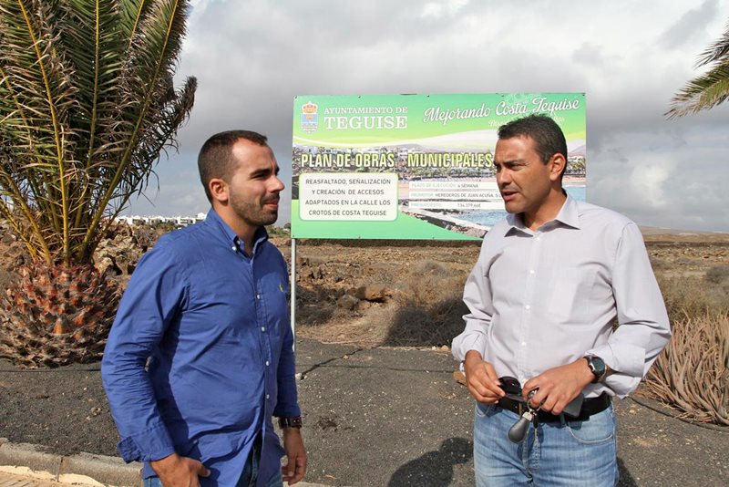 El alcalde de Teguise, Oswaldo Betancort, y el concejal de Urbanismo, Echedey Eugenio, visitaron este miércoles la calle Los Crotos de Costa Teguise, una vez concluida la obra de reasfaltado, señalización y creación de accesos adaptados, que forma parte del Plan de Obras municipal y que da por finalizada su primera fase, con una partida económica de 200.000 euros, que ha servido para mejorar vías muy deterioradas como la calle Los Crotos de Costa Teguise, o la calle Amor Indiano de Guatiza.