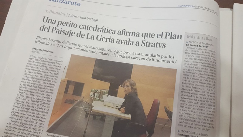 La catedrática de Derecho Administrativo de la Universidad del País Vasco, Blanca Lozano, señaló durante el Juicio del Caso Stratvs que el Plan Especial de La Geria avalaría a la bodega Stratvs. De esa forma la experta en derecho, que fue en calidad de perito de la defensa, señaló que el Plan Insular de Ordenación de 1991 del Cabildo “no cumple la función de ordenación de los recursos naturales de La Geria porque no se ha adaptado a las determinaciones medioambientales y ha perdido vigencia”.