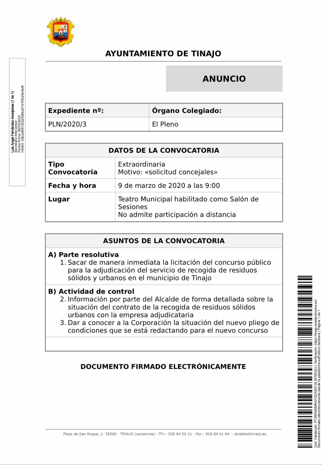 "En el pleno extraordinario" explican los portavoces, "el alcalde deberá informar de forma detallada, sobre la situación del contrato de la recogida de residuos sólidos urbanos, con la empresa adjudicataria, así como dar a conocer a la corporación la situación del nuevo pliego de condiciones, que se está redactando para el nuevo concurso, además de sacar de manera inmediata la licitación del concurso público para la adjudicación del servicio de recogida de residuos sólidos y urbanos en el Municipio de Tinajo".