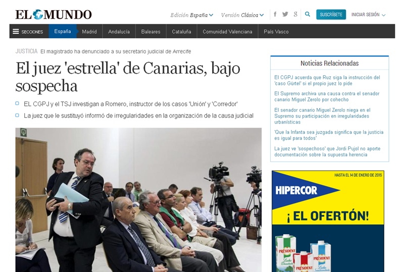 En un reportaje titulado “El juez 'estrella' de Canarias, bajo sospecha”, el periodista José Mújica explica cómo “las dos causas presentan un volumen de recursos y recusaciones tan elevado que el procedimiento está en el aire, según fuentes jurídicas consultadas por El Mundo”.