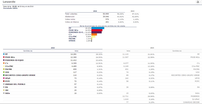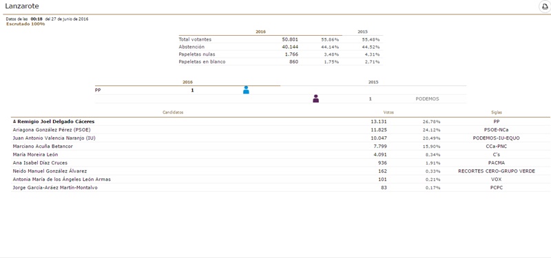 Aunque Lanzarote se ha quedado sin congresista, el PP ha sido también el partido más votado a la Cámara Baja en Lanzarote con 14.281 votos (28,32%), frente a los 11.115 que obtuvo en diciembre. El PSOE, con 12.369 apoyos (24,53%), casi 1.000 menos que en los comicios anteriores, se ha colocado como segunda fuerza, mientras que en la tercera posición se ha situado Podemos con 11.412 respaldos (22,63%). Por su parte, Ciudadanos ha conseguido 6.309 votos (12,51%) quedando como cuarta fuerza y Coalición Canaria como quinta con el apoyo de 4.489 ciudadanos (8,90%), perdiendo casi 2.000 votos.