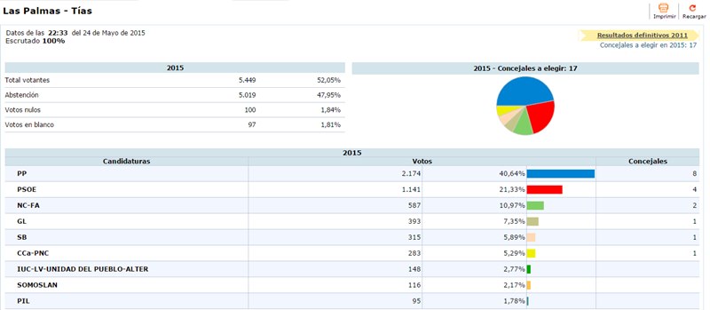 El PP ha conseguido volver a ganar en su feudo, Tías, quedándose a tan sólo un concejal de la mayoría absoluta. Con 2.174 votos, Pancho Hernández ha obtenido ocho ediles, los mismos que consiguió en las anteriores elecciones.