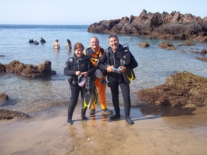 Durante su visita a los fondos marítimos de Puerto del Carmen estuvo acompañada por la concejal de Turismo del Ayuntamiento de Tías, Nerea Santana, y el instructor de Timanfaya Sub, Jorge Ceballos.