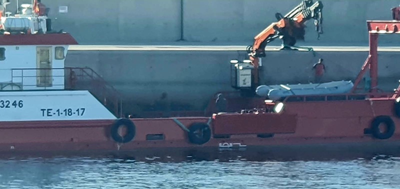 El barco grúa la extrajo en la oscuridad de la noche, bajo vigilancia de la Guardia Civil, y la descarga en el nuevo muelle del sur