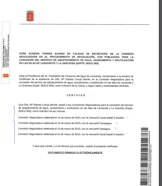 Pese a que en la sesión plenaria celebrada este jueves en La Graciosa, la consejera socialista, Ariagona Gonzalez, volvió a insistir en que esa negociación para el ciclo integral del agua la llevó Pedro San Ginés, Oswaldo Betancort mostró dos certificaciones, una del entonces secretario del Consorcio del Agua, y otra de la secretaria de la Comisión Negociadora en el procedimiento de negociación con publicidad, donde consta la participación de Mª Dolores Corujo en todo el proceso de adjudicación del ciclo integral del agua a Canal Gestión.