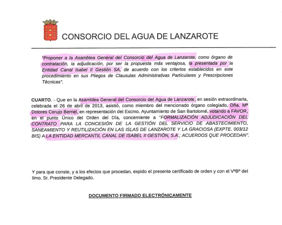 Asimismo, Betancort afirma que la actual secretaria insular del PSOE, no sólo votó a favor de proponer a la Asamblea General del Consorcio la adjudicación del contrato a Canal Gestión en la Mesa de Contratación del procedimiento negociado del 5 de abril de 2013 - que hay que recordar que se propuso por ser la propuesta más ventajosa y se acordó por unanimidad de los miembros-, sino que Mª Dolores Corujo votó a favor de la formalización de la adjudicación del contrato para la concesión de la gestión del citado servicio a Canal Gestión, en la Asamblea del Consorcio del Agua celebrada el 26 de abril de 2013.