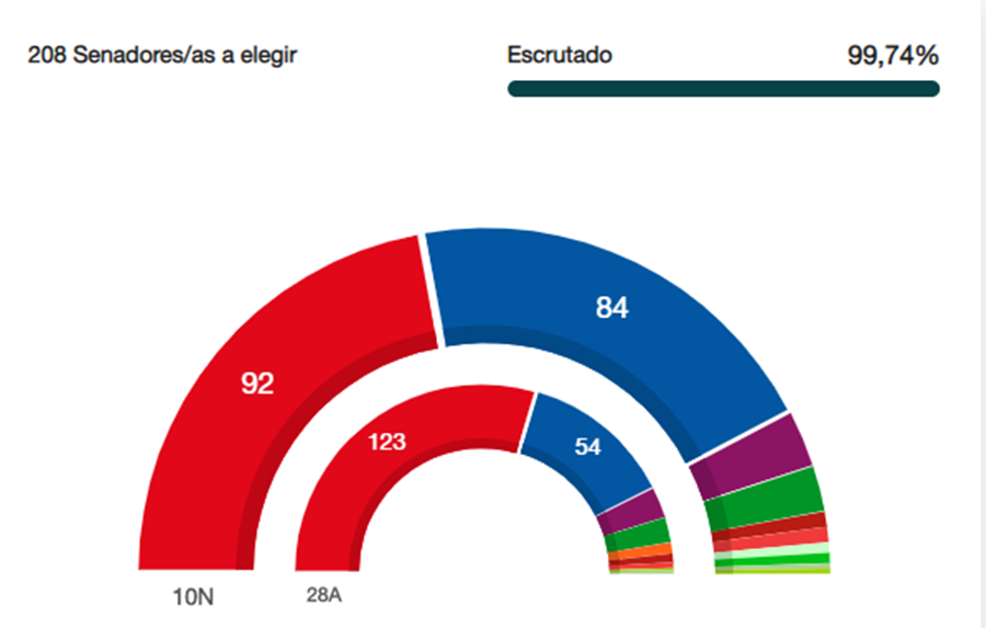Vox experimenta un enorme ascenso que duplica su representación en el Congreso, con 52 escaños frente a los 24 de los anteriores comicios, el PP sube hasta los 88 cuando tenía 66 representantes, y Ciudadanos sufre una debacle aún mayor que la pronosticada por las encuestas, al bajar de 57 a tan solo 10 escaños.