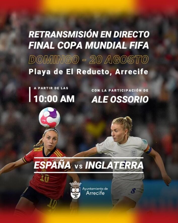 El Ayuntamiento de Arrecife está organizando un evento, en la playa de El Reducto para disfrutar de la Final de la Copa del Mundo Femenino, que este domingo 20, disputará la Selección Española frente a Inglaterra. La idea, resalta el alcalde capitalino, Yonathan de León Machín, es que esta cita- coincidiendo en los días centrales de las fiestas patronales de San Ginés- se convierta en un gran encuentro para apoyar el deporte femenino, a la altura de este gran éxito que ya supone para España, haber alcanzado por primera vez la final de un mundial, y paralelamente dinamizar la ciudad en una mañana del domingo.