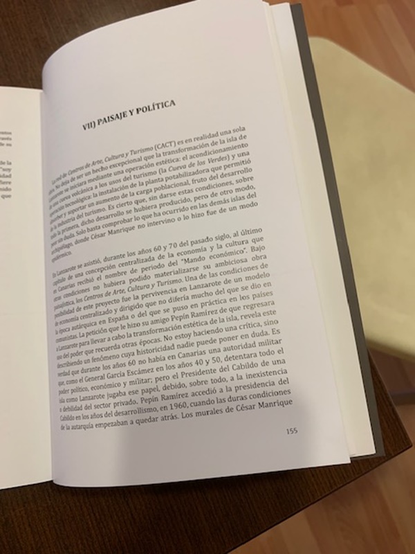 Al parecer, los capítulos 7, "Paisaje y Política", y 8, "Paisaje y Ecología", pudieron ser los responsables de la retirada del libro. En ellos el autor y amigo de César Manrique desmiente la ideología de izquierda que la FCM ha tratado de impregnar al artista.