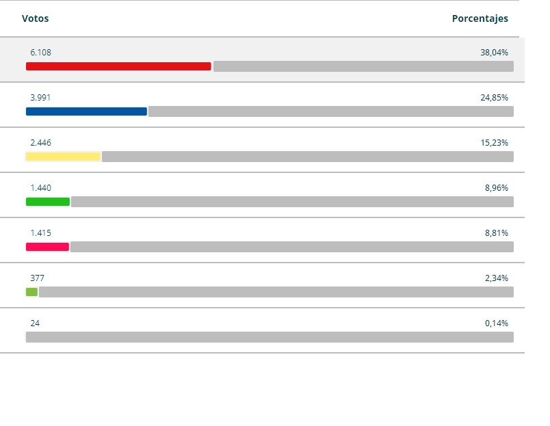 Con 6.108 votos, y el 38’04 de porcentaje, adelanta al PP que cuenta con 3.991 votos y el 24’85%