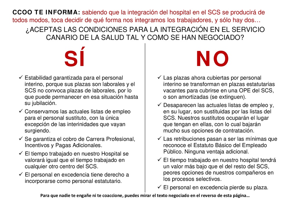 El sindicato CCOO en Lanzarote ya ha empezado a difundir a través de las redes sociales (whatsapp, facebook …) la información sobre los aspectos positivos que va a suponer a los trabajadores del Hospital Insular la integración en el Servicio Canario de Salud (Sanidad Pública) al pasar todos ellos con los mismo derechos laborales que tienen ahora y asegurando sus puestos de trabajo. Y explica, ademas, de las desventajas de votar que “no”.