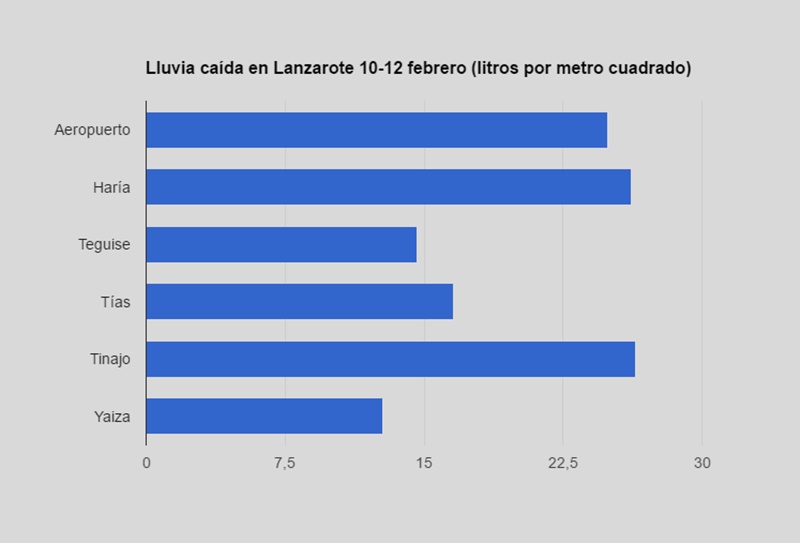 Tinajo tampoco se quedó cortó de lluvia. Según la Aemet, en el municipio cayeron 26,4 litros por metro cuadrado durante todo el fin de semana. Cantidad de lluvia parecida se registró en Haría, que alcanzó los 26,2 litros. aunque en algunos puntos del municipio se registró mucha más agua, como en el caso de Máguez, donde según datos de la Granja Agrícola Experimental cayeron hasta 40 litros por metro cuartado. En la zona del aeropuerto se registraron 24,9 litros por metro cuadrado, en El Mojón 21, en Arrieta 19,5; en Tegoyo 17; en Tías 16,6; en Soo 15,4; en Teguise 14,6; en Guatiza 14; en Yaiza 12,8; en la zona de la Granja Agrícola (Tahíche) 8,3, y en Arrecife 7.