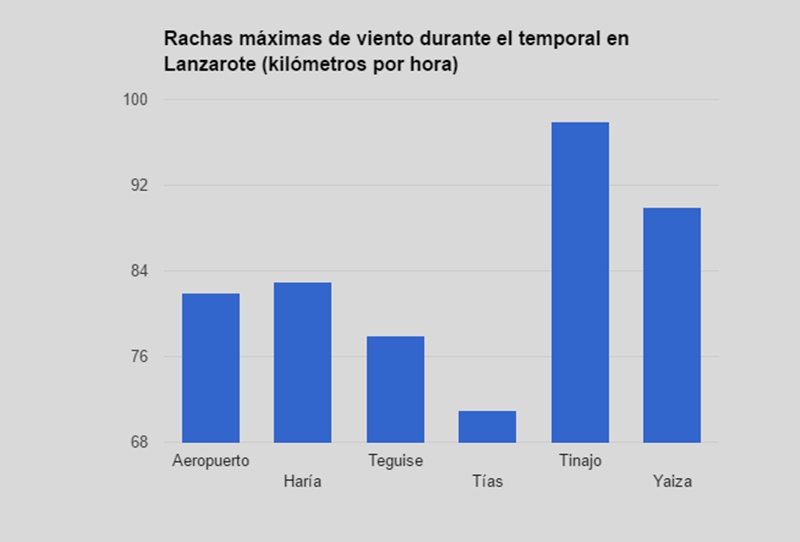 No obstante, el viento sopló con fuerza en toda la isla. En Yaiza, llegó a haber rachas de 90 kilómetros por hora, mientras que en Haría se alcanzaron los 83 kilómetros y en la zona del aeropuerto los 82. En Teguise, se registraron rachas de 78 kilómetros por hora y en Tías de 71.